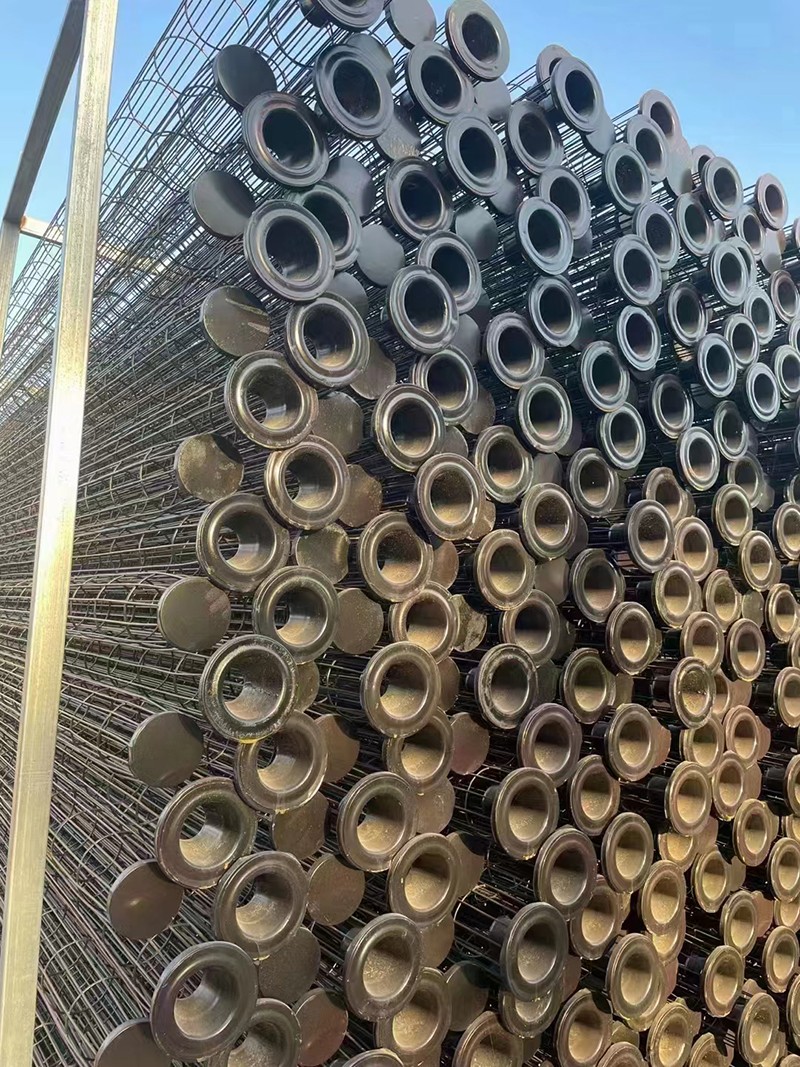 除塵布袋骨架是采用直徑為3-4個的碳鋼絲或不銹鋼絲為原材料,由縱筋和支撐環(huán)縱橫疊交焊接成的籠形件。除塵布袋骨架安裝在脈沖除塵器和氣箱式脈沖除塵器中的花板孔上,用來支撐除塵濾袋防止塌陷,有助于粉塵的清除和提供除塵效率。粉塵是附著在除塵濾袋的外表面,含塵氣體經(jīng)過除塵器時,粉塵被捕集在濾袋的外表面,而干凈氣體通過濾料進入濾袋內(nèi)部后經(jīng)風(fēng)機排出。